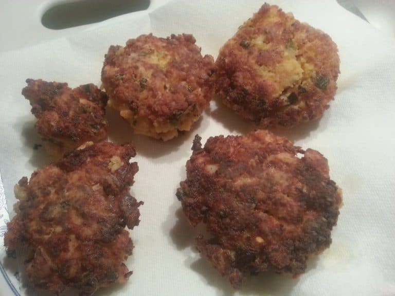 Mix everything together. Make them into patties, roll lightly in flour and fry them in quality oil. (I used canola.) I cooked them about 7-8 minutes on each side until they were browned.