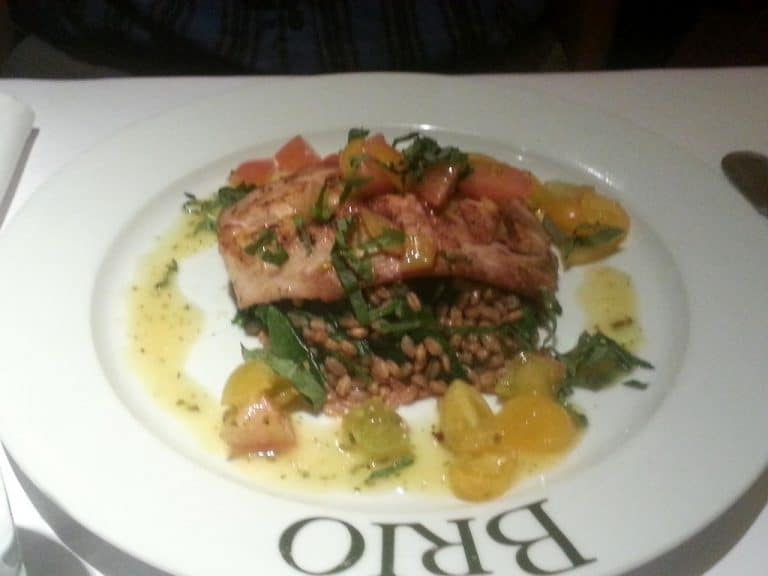 First though, my husband’s entree of choice: Grilled Mahi-Mahi, which came on a bed of farro with tomato-basil vinaigrette and spinach. Of course I tried it — I wouldn’t be a good food blogger if I didn’t try everything, right?? — and could have happily ordered that as well, but I let him eat the rest of it and stuck to my risotto. Getting full.