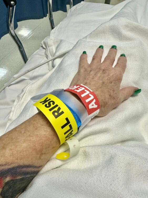Getting a nerve block is no joke, but it’s also not a big deal. It’s done in a surgical center, complete with serious paperwork, no eating after midnight, and getting gowned up. You also get these fancy wristbands if you’re allergic to anything or if they score you as a fall risk — which I was, due to my instability with the nerve pain.