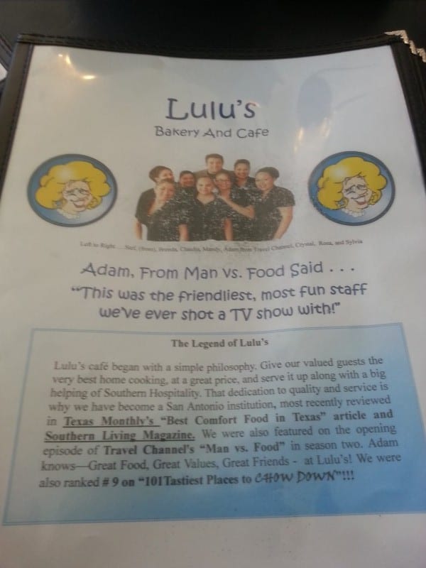 When we lived in South Carolina, we were either watching Nascar or Food Network, and since Nascar’s primarily a weekend sport, we saw a LOT of Food Network and the Travel Channel. When we ran out of shows there, we switched to the Cooking Channel, and any other food broadcasting we could find. We learned a lot about food, and routinely kept notes on places to visit. Knowing we’d be traveling across the country, a lot of our restaurants were places along the route, and one week before we left, we watched an episode of Man vs. Food, with Adam Richman hosting an episode that included Lulu’s San Antonio, Texas, a cafe known for it’s three-pound cinnamon roll.