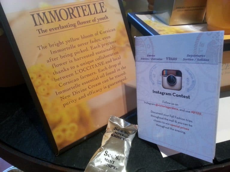 Last week, my daughters and I attended the Victoria Gardens Fall Fashion Event in Rancho Cucamonga, California. Entitled Passport to Fall, it went from 6pm – 8pm, and the first batch of people who signed in for their passport (which led us around the mall with directions for each involved shop) received free gold totes. (We scored and got them, and we only arrived in line at 5:50pm!) Once we received our passport, we walked from shop to shop, wandering, looking at merchandise, trying out samples, and when at all possible, meeting the shop staff and any fashion blogger that might be helping host. By the end of the night, we’d received a lot of samples, quite a few coupons and found shops we didn’t even know about that are now on our regular “must visit” list.