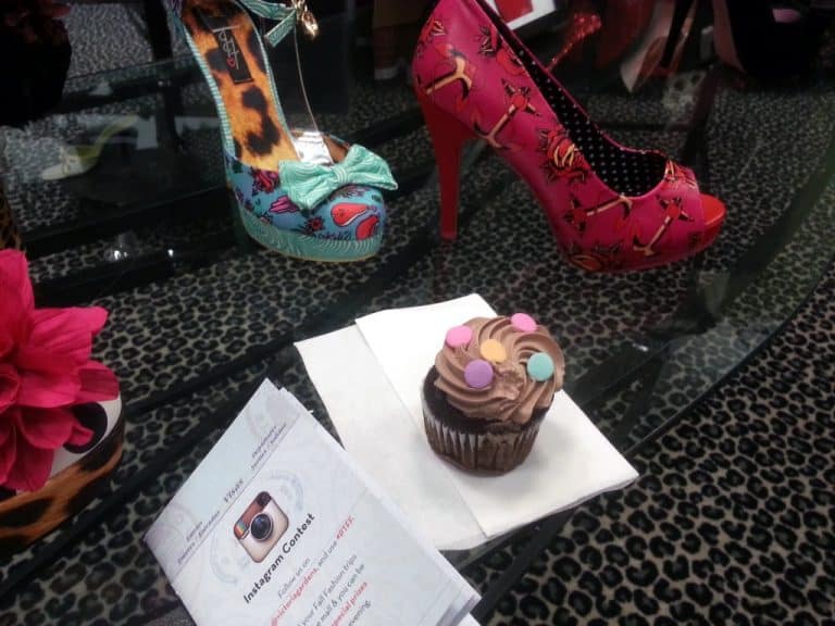This photo…lo-lo-love it! The patterns around the store, Sassy Fashion … the theme, the decor, the selection. Ahhhh, I could have totally wandered. Shoes were affordable and funky, my perfect requirements for a shoe store, and the Hot Dog on a Stick people were there giving out samples. Alas, I couldn’t eat the hot dog (darn beef intolerance) but I did win a spin of the wheel and got a free lemonade for my next visit, and the cupcake…ahhh, the cupcake. I’m picky with cupcakes — you tend to be that way when you bake them on your own usually — and these were moist, chocolaty and not overly sweet. (Shhh, I ate the whole thing!)