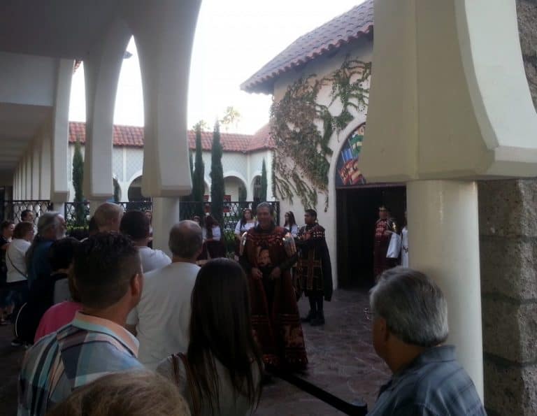 People take Medieval Times seriously! The line was already building when we arrived at 5:20 for a 7pm showing on a Wednesday night. The venue is located in the middle of all-things-fun in Buena Park, which is in the O.C., barely a 1/2 mile north of Knott’s Berry Farm and only about 15 minutes from Disneyland. (You can’t beat that for coolness!) We were escorted to the ticket booth at 5:45, which was good as the little guy needed to use the facilities after an hour’s drive because the 91 freeway at that time of day stinks.