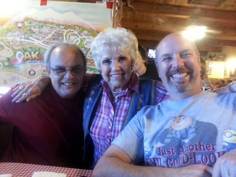 Dinner.Was.Amazing. The chicken is fried to perfection, the seasonings are dead-on what you’re looking for and there’s not a drop of oil to be seen. I ordered the seasoned fries and everyone else got the mashed potatoes. My little dude got creative and dipped his chicken strips into the mashed potatoes — great idea! He practically licked his plate. The highlight of the meal was when Apple Annie herself stopped by our boisterous table and chatted up the men. As you can see here, they both very much enjoyed it!