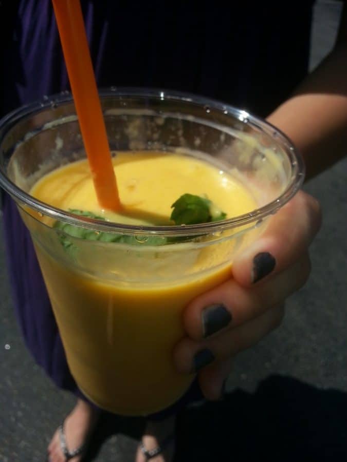 Dd and I decided we’d each try something different. I, the one with the wallet, got to choose first, so I got the Lassi. I’d seen these on Food Network (Aarti Party, anyone?) but never had one myself. I was not disappointed! Perfect thing to help fill an empty tummy while helping with thirst. Shopping is hard work!